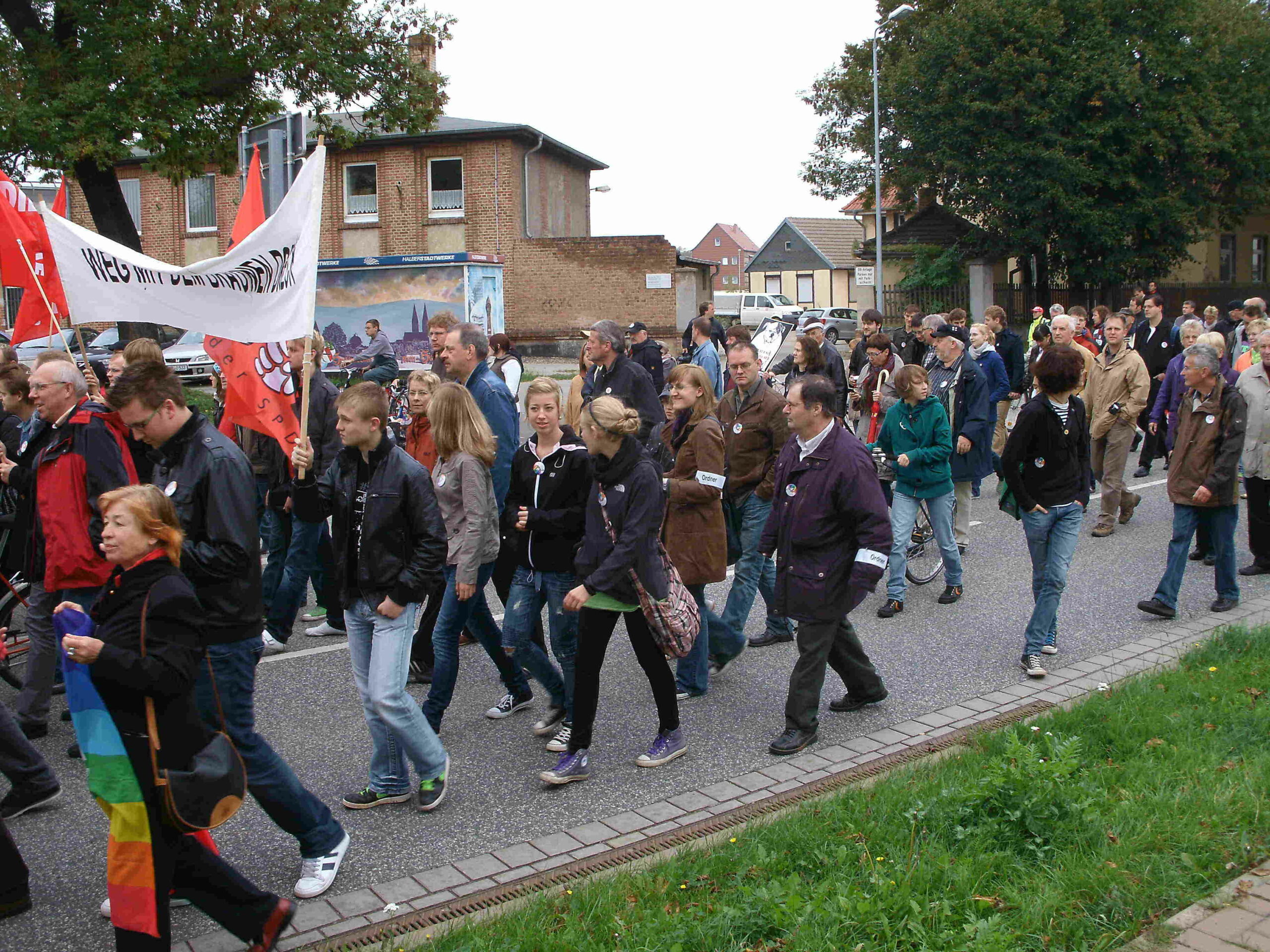 Zirka 200 Rechtsextreme marschierten am 2.Oktober unter dem Motto “20 Jahre Einheit – Wo bleiben Freiheit, Bürgerrechte und soziale Gerechtigkeit? Für unser aller Recht auf Zukunft!“ in Halberstadt auf. Aus diesem Anlass organisierte der DGB und das „Bürgerbündnis für ein gewaltfreies Halberstadt“ eine Protestaktion um den Versuch der Nazis zu unterbinden, die Bedeutung des 3.Oktober für ihre menschenverachtende Ideologie zu instrumentalisieren. Zu den Unterstützern dieses Aufrufs gehörten unter anderem die Halberstädter SPD und die Harzer Jusos, die in Zusammenarbeit mit dem Juso-Landesarbeitskreises gegen Rechtsextremismus einen wesentlichen Beitrag zum Gelingen der Gegenaktionen leisteten. Über 40 Sozialdemokraten und Jusos unterstützten die Kundgebung vom Bahnhofsvorplatz bis zum Holzmarkt und konnten im Anschluss mit einer Sitzblockade den Aufmarsch der JN für eine knappe Stunde verzögern, bis deren Route umgeleitet wurde. Zum Abschluss der Gegenveranstaltung des Bürgerbündnis, gab es ein Kulturprogramm mit Beiträgen von Vertretern aus Politik und Gesellschaft und verschiedenen musikalischen Darbietungen, das die gelungene Veranstaltung hat langsam ausklingen lassen. Aus Sicht der Veranstalter wurde der Tag als Erfolg gewertet. Zwar ist es nicht gelungen die Nazis nachhaltig zu behindern, allerdings blieb die Außenwirkung der JN weit hinter deren Vorstellung zurück.